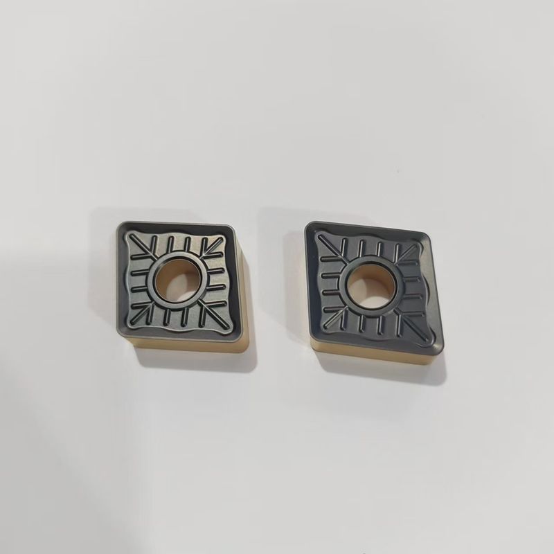 Sisipan CNC Karbida dibuat dari bahan tungsten karbida berkualitas tinggi, yang dikenal karena ketahanan aus dan ketangguhannya yang sangat baik. Bahan ini memiliki kepadatan 14,2 g/cm3, sehingga ideal untuk memotong bahan keras seperti baja, besi cor, dan aluminium. Ujung potong sisipan dilapisi dengan lapisan titanium nitrida atau bahan keras lainnya untuk meningkatkan daya tahan dan umur panjangnya.